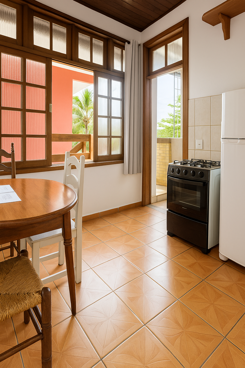 - Cozinha equipada com utensílios essenciais (fogão e geladeira)